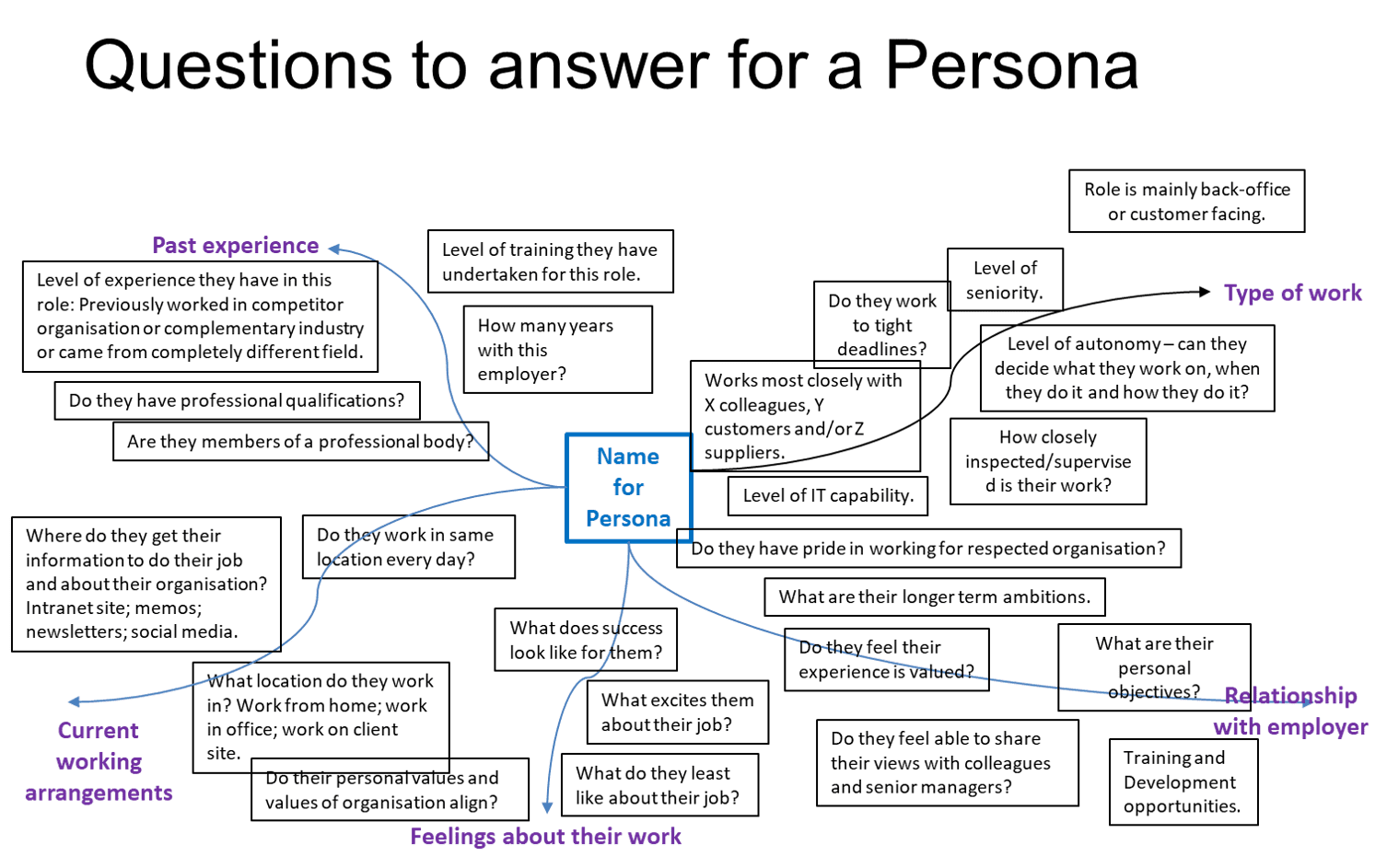 Use this mind map of potential questions to answer to develop personas for your stakeholders impacted by change. If you want to be successful in persuading stakeholders to change their ways of working, you need to be able to understand their perspective, so that you can tailor everything you communicate to meet their needs.