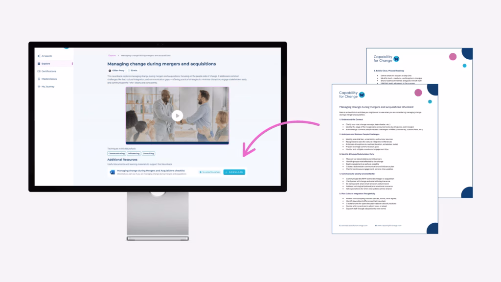 Navigate mergers and acquisitions with confidence using this practical checklist. From understanding context and anticipating people challenges to engaging stakeholders, communicating clearly, integrating cultures, building phased roadmaps, equipping leaders, and fostering agility – this guide ensures you manage change effectively and keep teams informed, motivated, and aligned.